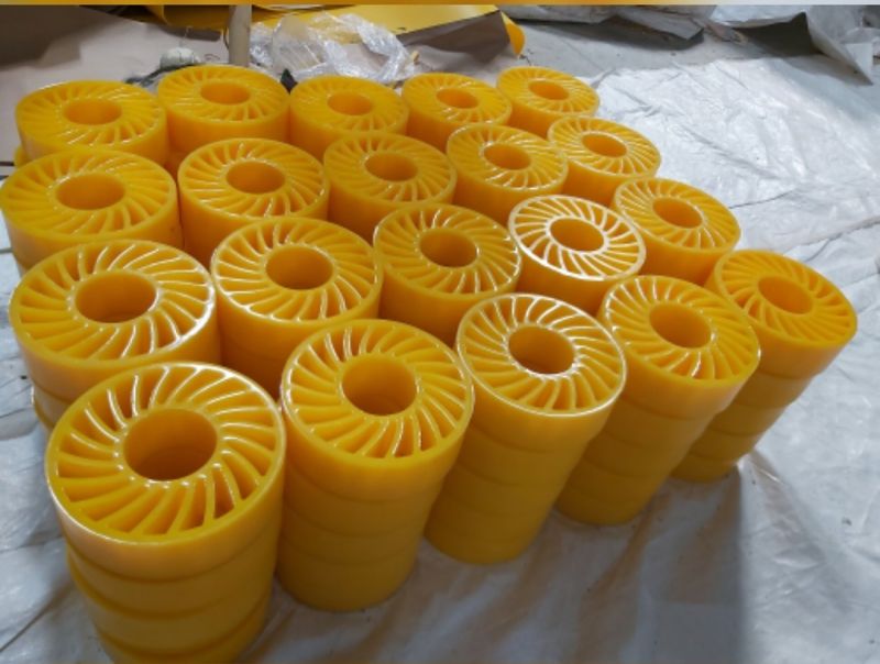 No-crush wheels are flexible polyurethane rollers used in packaging, bottling, and other industries to transfer materials, like corrugated cardboard, without crushing or damaging them. Their key features include a soft, flexible surface that deforms to accommodate variations in material thickness, preventing damage to the material's surface and ensuring a smooth, stable feed. These wheels are durable, abrasion-resistant, and available in various sizes and hardnesses to suit specific applications, often with internal ball bearings for ease of installation and smooth operation.